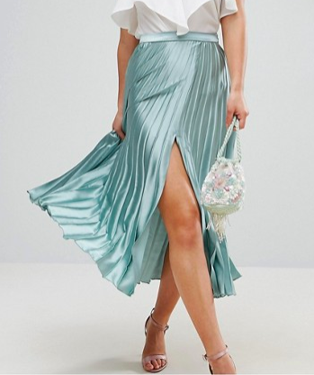 Jupe mi-longue en satin plissé avec fente ici