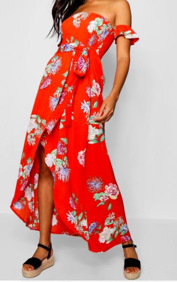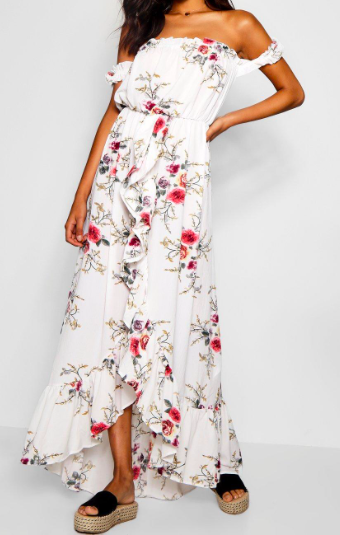 1.Robe maxi à fleurs épaules dénudées Boohoo ici