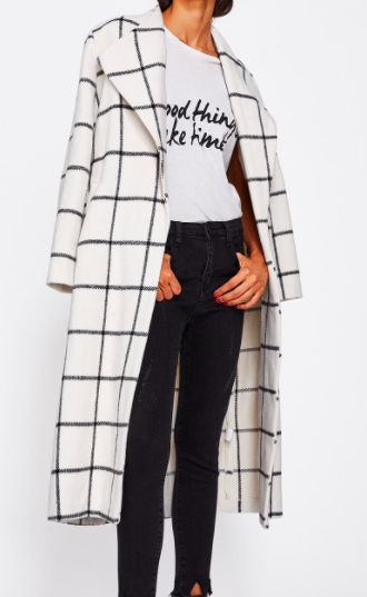 Manteau blanc à carreaux ici Blazer cape ici Body asymétrique ici Body rouge ici